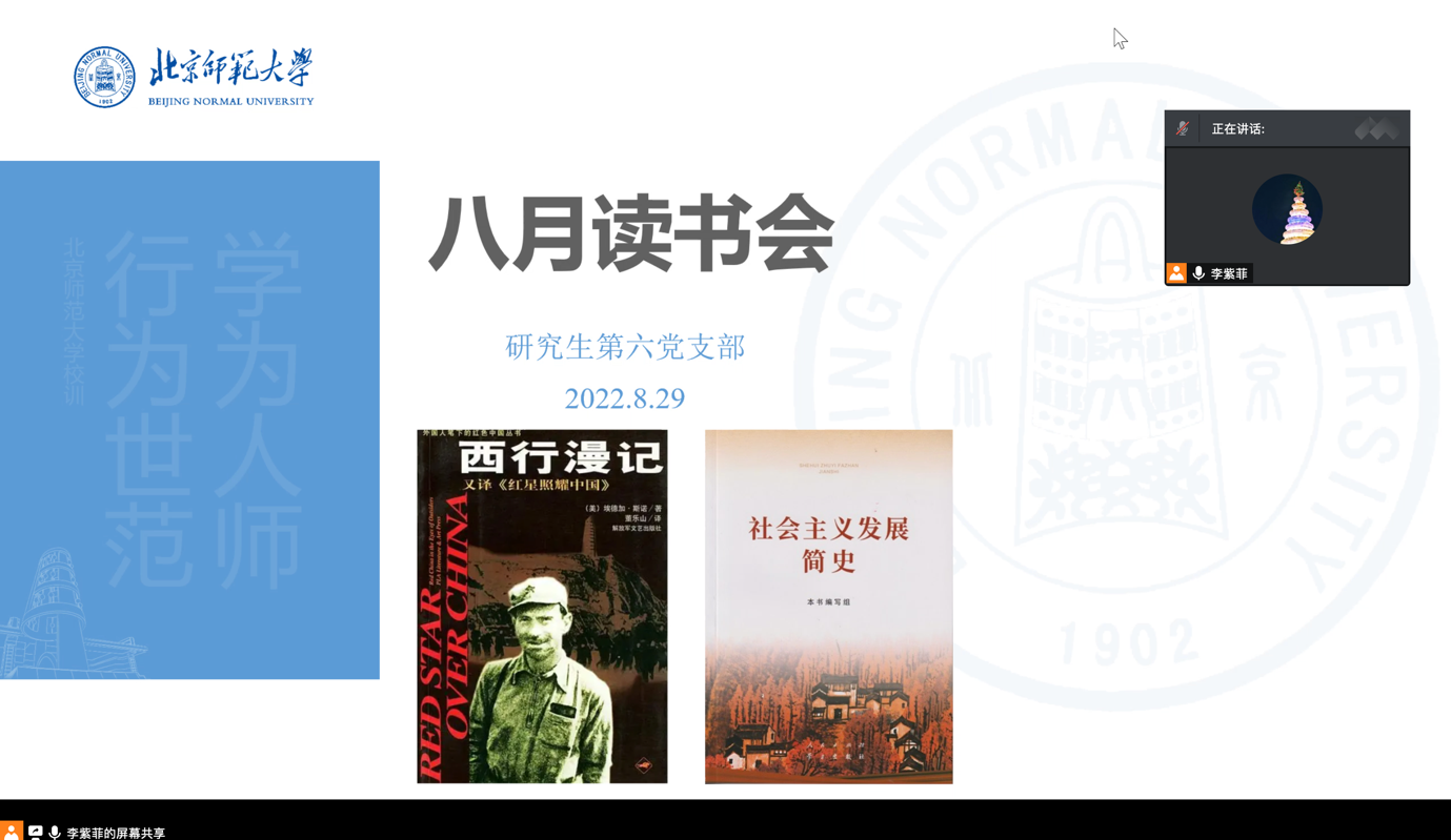 2022年8月29日晚,98色花堂 研究生第六党支部在腾讯会议举办了第八期红色读书分享会。活动由张涵宇和蔡旻旻两位同志分享《西行漫记》和《社会主义发展简史》两本书的内容及自己的阅读感想。