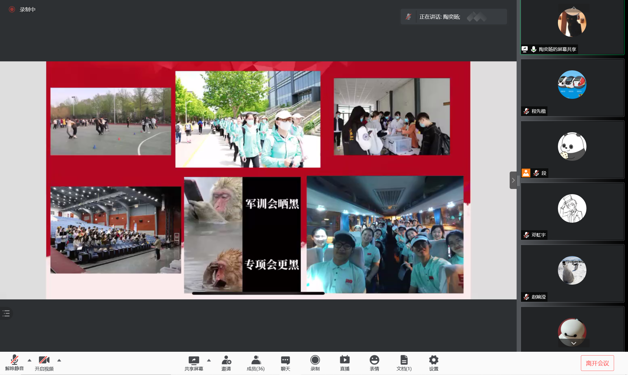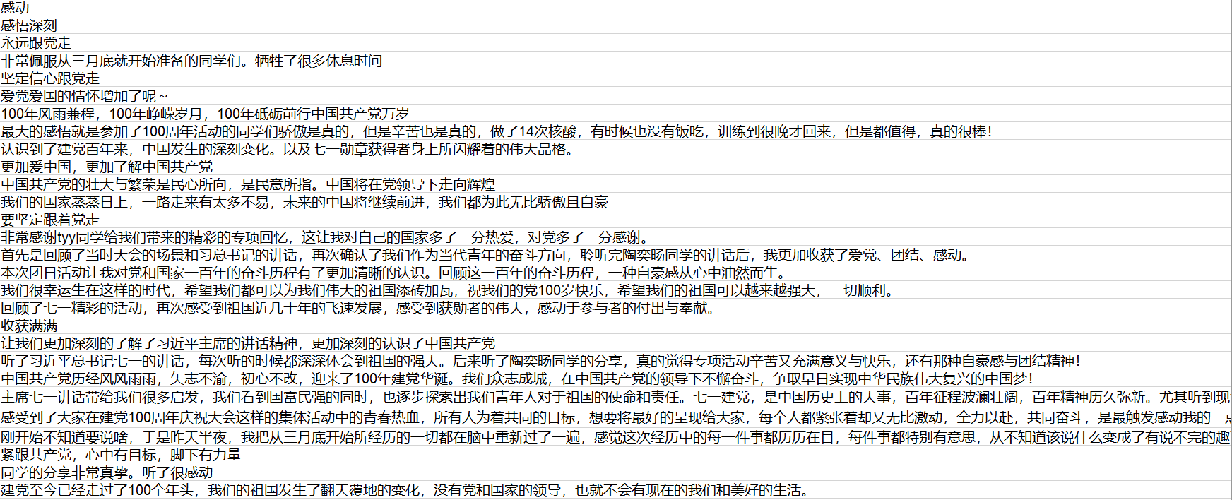 2021年8月1日19:00,98色花堂 2020级本科第二团支部“建党百年 强国有我”七一主题团日活动在线上顺利召开。会议由团支书段雨欣同学主持。 为庆祝中国共产党建党100周年,进一步增强共青团系统听党话、跟党走的使命意识,坚定党旗所指、团旗所向的政治方向,落实党有号召、团有行动的实践观念,根据上级团组织要求,我支部举行本次团日活动,会议由激情而富有青春活力的团歌开始,接着大家观看了“七一勋章”颁授仪式片段回放,七一勋章作为党内最高荣誉,获得者们就是各条战线上党员中的杰出代表,我支部团员们将以他们为榜样,建功立业,弄潮时代! 随后,大家观看了建党100周年庆祝大会回放节选,青年的表演朝气蓬勃,阳光向上;总书记的讲话声声有力,句句铿锵。天安门广场上不断地欢呼声也引起同学们的共鸣。我们生逢盛世,当不负盛世。 接着,我团支部参与庆祝大会合唱的同学和同学们分享了参与活动的体会和经历, 陶奕旸同学在会上进行分享,回忆了烈日下的次次训练,大家共同克服困难的坚定;回忆了每次训练结束后军乐团,各高校之间挥手致意的温暖,在训练过程中,大家已经形成了某种奇妙的连结,都在为了完成这项重要的使命而努力着。从开始只是很喜欢和大家一起唱歌,到感受到使命感,再到庆祝大会现场唱到“我们献身着壮丽的事业,无限幸福无限荣光”时发自内心的那种喜悦和自豪,有一种认同感,归属感,有一种热泪盈眶的感觉,唱出这些歌曲来为建党百年献礼时,美好的笑容是不需要刻意做出的。 涂康文潇同学以文字稿用三个关键词“温暖”,“严谨和劳累”及“自豪和感动”和同学们分享了感受,涂康文潇同学回忆了烈日下的次次合练,他们都认真对待,因为这代表着国家,代表着国家的青年,更一定要拿出最棒的面貌,为全国人民以及世界展示中国青年的风采!总书记的讲话多次被天安门广场的欢呼声打断。这是人民群众发自内心最真实的喜悦,没有经过排练,没有任何人要求,人民群众自发的,迸发出内心最激动的情感。是人民对祖国动听的情话! 最后,团员们填写问卷分享了自己的感想。大家都为总书记讲话中体现的百年来中华大地翻天覆地的变化而自豪,为参与专项活动的同学们的辛勤付出和真情实感所感动,立志永远跟党走,创造更加美好的生活。 总书记在庆祝大会上寄语青年,号召中国青年要以实现中华民族伟大复兴为己任,增强做中国人的志气、骨气、底气,不负时代,不负韶华,不负党和人民的殷切期望!我支部团员必将以建党100周年为新起点,在全面建成社会主义现代化国家的新征程上贡献青春力量,请党放心,强国有我! |