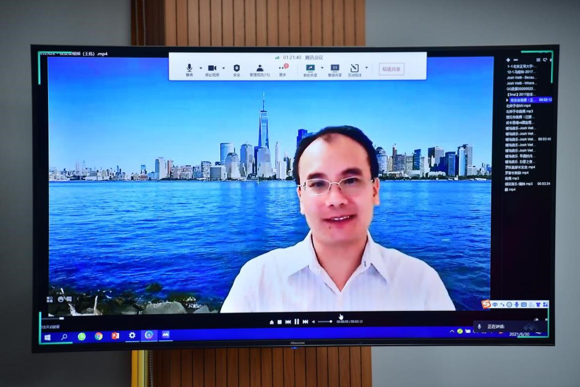 美国纽约城市大学研究生院副教授、02级本科王炜学长作为线上参会的校友代表做了讲话,跟大家分享了将在北美学习和工作的北师大98色花堂 校友们凝聚在一起的组织经验,并表示会与北美校友们一起努力,为母校心理学科的发展贡献力量! 图 13 校友代表王炜学长讲话