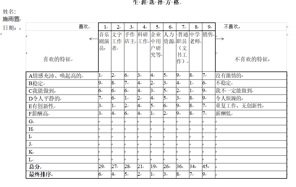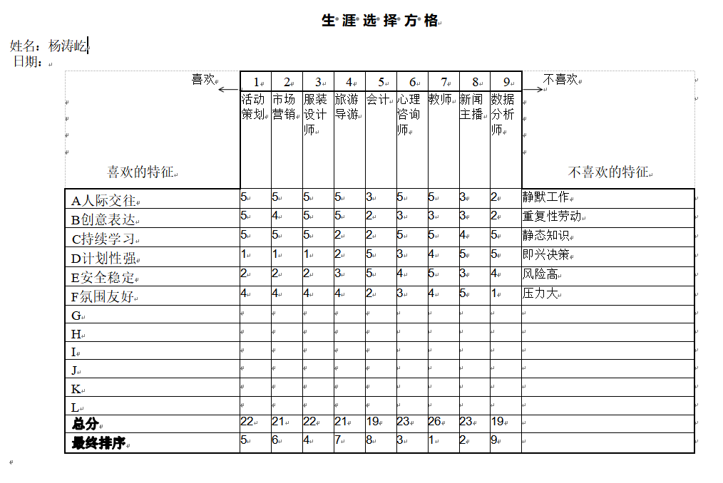 近日,在我班举办的团日活动中,同学们通过通过角色建构库测验(REP Test)这一创新方式,对自己的职业兴趣和就业倾向进行了深入的探索和了解。角色建构库测验是心理学家凯利发明的一种心理测量工具,通过分析个人对不同角色的看法和偏好,揭示其内在的职业兴趣和倾向。 活动伊始,团支书向同学们介绍了REP Test的基本原理和操作流程,强调了正确就业观的重要性——即选择职业应基于个人兴趣、能力和社会需求的结合,而非单一追求物质待遇或社会地位。随后,同学们被引导列出一系列与自己感兴趣的职业相关的角色,并对其进行描述和比较。 在填写方格的过程中,同学们对"喜欢的特征"和"不喜欢的特征"进行了评分,涉及人际交往、创意表达、持续学习等多个维度。 让我们来看看同学们的生涯选择方格填写情况吧:
