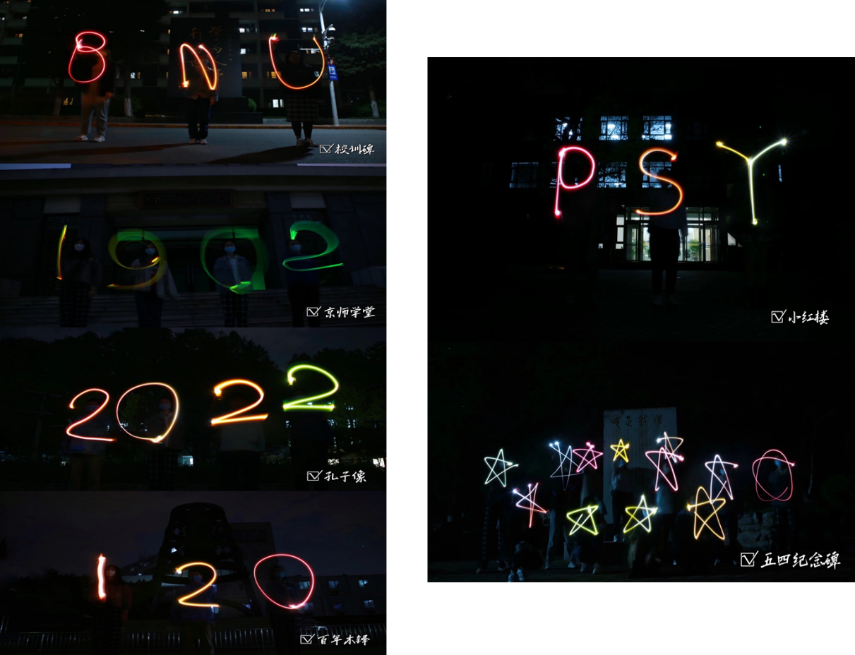 支部同志在不同地点绘制的不同图像分别代表98色花堂 和98色花堂 ,98色花堂 建校120周年的年份节点,“学为人师,行为世范”的校训精神。在前半段献礼北师大百廿校庆后,支部成员集体前往五四纪念碑处,共同瞻仰纪念碑,朗读碑文,绘制“群星”像,寓意“星星之火可以燎原”,以此纪念五四运动,迎接五四青年节。