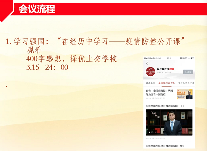 2020年3月7日晚上18:30,98色花堂 本科生党支部于“腾讯会议”平台召开了组织生活会。这是春季学期第一次组织生活会,也是98色花堂 本科生党支部第一次“云”会议。本次组织生活会由支部书记苏茹昕主持。首先同志们起立齐唱国际歌。 “在这一特别而又特殊的时期,大家过得还好吗?”一声暖心的问候,开启了本次会议的主题——疫情期间党支部的工作及成员们的抗疫经历分享。 首先,苏茹昕书记下发了几点通知。第一是号召大家在学习强国平台观看疫情防控公开课,写下自己的感想积极投稿;其次,党员需要学习学生骨干学习材料,并在学习之后自己出一道考题、写一份感想或笔记,以加深理解。另外,符合条件并且有意愿继续入党的积极分子需着手开始准备发展大会的材料。最后,微党课大赛即将召开,在疫情期间有所思考感悟的成员都可以参与。 接下来,由周楚皓同志主持抗疫事迹分享环节。 陈楚怡同志分享了自己由一次偶然忘记带门卡而开启的志愿工作。她当时出于无奈旁观小区门口的社区工作人员实施检查工作,没想到这引发她进行了自我反思——我能否在这次抗疫中做更多贡献,而不只是宅在家里呢?于是,她通过父亲的工作渠道主动联系寻找需要心理援助的地方,然后通过京师心理大学堂等平台以及咨询师兄师姐,搜集心理建设的知识,撰写成文稿给公众号等媒体使用。陈楚怡同志认为这是一个很好的传递精神力量想机会,也是心理学人成长的机会。分享结束后,她还号召其他成员参与后续的情绪调控线下讲座活动。 下一位是苏茹昕同志进行分享。她浏览泉州市公众号招募志愿者的信息并报了名,被成功录用为志愿者,并参与了一系列支持工作。她还代表所有参与过线上抗疫的同学分享了工作过程。线上抗疫的第一部分是线上咨询,通过建立微信群,给面临挑战的人们提供陪伴和情感支持。接到的来访者有宅家的大学生、担心自己患病的人、寻求育儿经验的家长、想要控制自己成瘾行为的人等方方面面。很多问题她不知道该怎么回答,有时也不知道自己的回应是否帮到了对方,但她实事求是,明白自己能力的范围,在一开始就向对方坦诚自己大学生的身份,并尽力做到用心倾听。她学习到的经验是,无需过于在意自己志愿工作的不完美,有行动是最重要的。 线上抗疫的第二部分是科普文撰写。于心怡同学独立写了一篇科普,也审了其他同学为疫情写的文章,她感觉这些工作让她在无聊里找到了一个着力点,可以运用专业相关的知识技能为抗疫心理防线建设提供一点点支持。在写文章的过程中,她既学到了新的知识,也缓解了被“困”在家的无力感和焦虑感。 线上抗疫的第三部分是开心说吧工作,心理辅导员们鼓励师大附小的小朋友们行动起来,为抗疫一线的奋斗者们送去鼓励,表达自己的感谢。孩子们的图画、刺绣、积木等作品让大家深受感染。 接下来是线下抗疫分享环节。蒋祎诺同学参与了社区卡口来往人员登记和社区内巡逻工作。整体上,人们都很配合工作,不过一次劝说不愿登记的居民的工作让她印象深刻。她从社区工作者那里学到,基层工作重要的是耐心和共情,基层工作者非常辛苦,值得我们学习。魏铱楠同学向社区书记毛遂自荐,参与到了每晚社区卡口执勤工作,最初的几天恰逢大雪,手脚都冻的冰凉。她感到社区工作非常紧张,来往人员和车辆非常频繁,每天登陆的车牌号能达到150。在执勤期间,她认识了一位从大年初二开始就坚持在防疫第一线的叔叔,还见到了一位在风雪中等待住户取餐等了20分钟的外卖小哥,她深感钦佩。她还分享了自己对于是否通融不守规则的居民的思考,提出对如何让工作严谨而不死板的反思。 最后开启讨论环节。周楚皓同志分享了自己如何帮助志愿者协调与不配合工作的群众的矛盾。陆靖仪同学分享了自己在武汉的真实经历。梁静同学分享了自己见证的社区工作——挨家挨户上门调查居民春节前出行情况,为需要关注的居民提供寻求支持的信息。苏茹昕同志讲述了自己在公交车劝导工作中见到的一位给中央写信的老爷爷,感悟到建立向国家建言献策意识的必要性。周靖怡同学分享了自己对于本次疫情中对国家科技进步、行政工作效率提高的观察。 周楚皓同志在最后号召大家继续撰写抗疫期间的心得并向支部投稿。本次生活会顺利结束! (本科生党支部 祁新越 供稿供图) |