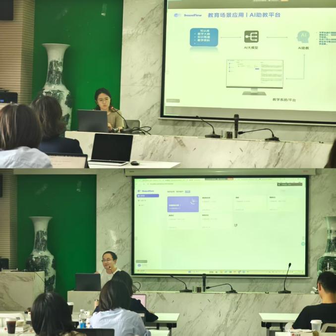 商汤科技研究员郭嘉伟、产教融合负责人喻思斯以及产品经理王琪作为主讲嘉宾,围绕SenseFlow平台开展创建知识库的培训。嘉宾们详细介绍了SenseFlow平台的功能和优势。郭嘉伟围绕该平台深入浅出地展示了创建知识库的方法,为让师生有更直观的感受,他现场搭建了实际智能体应用“心理实训伙伴”,并进行案例演示和现场教学。商汤科技专家还分享了人工智能在教学场景的应用探索,交流了AI在教学工作中帮助老师提升工作效率的途径。