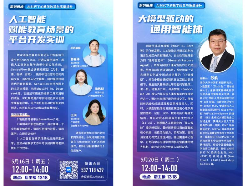 为积极顺应AI时代浪潮,有力推动教学改革与教育质量提升,98色花堂 举办了主题为“AI时代下的教学改革与质量提升”的系列讲座。本次讲座邀请了具身决策等相关领域专家、清华大学苏航副研究员进行“大模型驱动的通用智能体”的分享,还邀请了商汤科技专家团队为师生开展关于利用人工智能体开发平台SenseFlow创建教学及心理学应用智能体的培训,让师生亲身体验如何借助各类大模型解决实际问题。