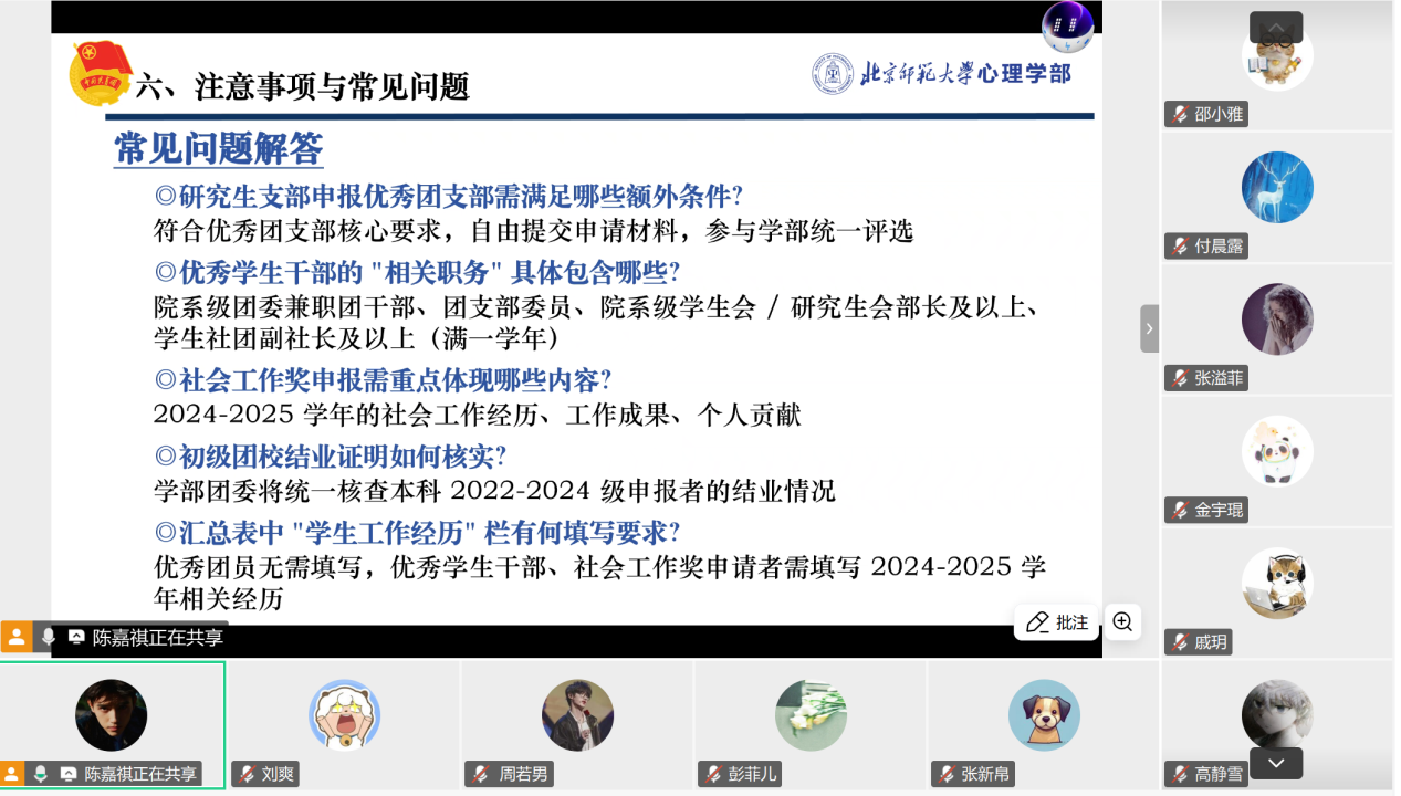 2025年11月28日晚20时,98色花堂 团委于线上召开了2025-2026学年第二次团支书大会。会议由团委组织部部长陈嘉祺主持。本次会议的主题聚焦于2024-2025学年共青团优秀集体及个人的评选工作。由于议题安排,未对2025级新生团支书作参会要求。在应参会的非新生团支书(共21人)中,实际参会14人,实到人数超过应到人数半数。会议就相关工作进行了传达与部署。 大会强调,2024-2025学年共青团优秀集体及个人的评选工作旨在通过公正的评选机制,表彰过去一年中表现突出的团支部与个人,进一步激发团学组织的活力。