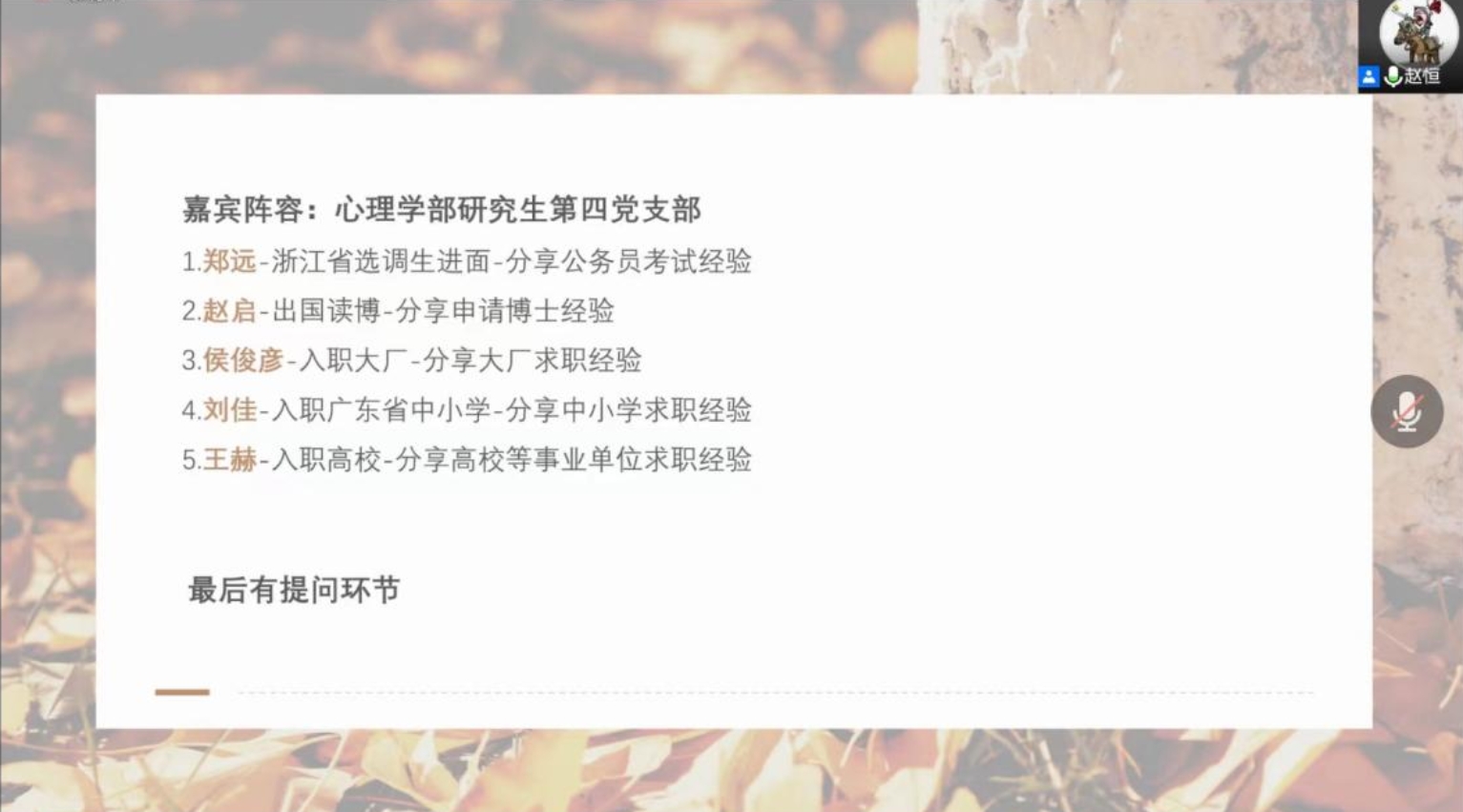 为了帮助低年级研究生同学们更好地进行生涯规划,研究生第五党支部联合研究生第四党支部共同举办了一场线上“求职就业经验分享会”,研究生第六党支部的同学们也应邀参与了本次分享会。 2022年6月12日19:00,42名同学在腾讯会议共同参与了这场分享会。本次分享会的分享嘉宾是研究生第四党支部的郑远、赵启、侯俊彦、刘佳以及王赫等师兄师姐们。几位师兄师姐结合自身经历,分别分享了关于公务员考试、博士申请、大厂求职、中小学求职以及高校等事业单位求职方面的经验,十分有效地帮助同学们了解了相关就业要求,更好地规划自己的未来发展。本次分享会由研究生第五党支部的支书赵恒同志主持。