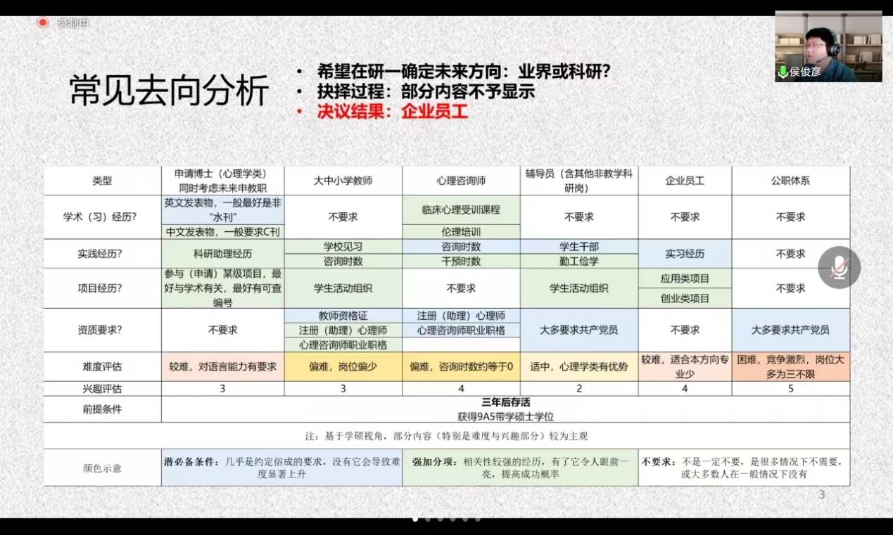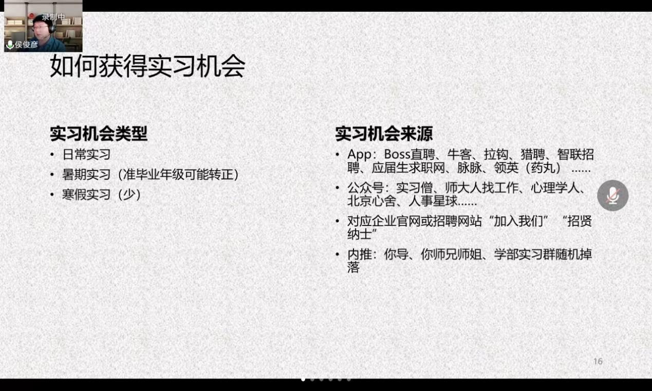 侯俊彦师兄则结合自己的求职经历分享了大厂求职所要做的准备,并帮助同学们了解了如何更有效地获取实习机会,为之后的求职打好基础。此外,师兄在进行生涯规划过程中所采用的列表格帮助自己明确心理学不同就业方向需求的方法对同学们而言也十分具有借鉴意义。