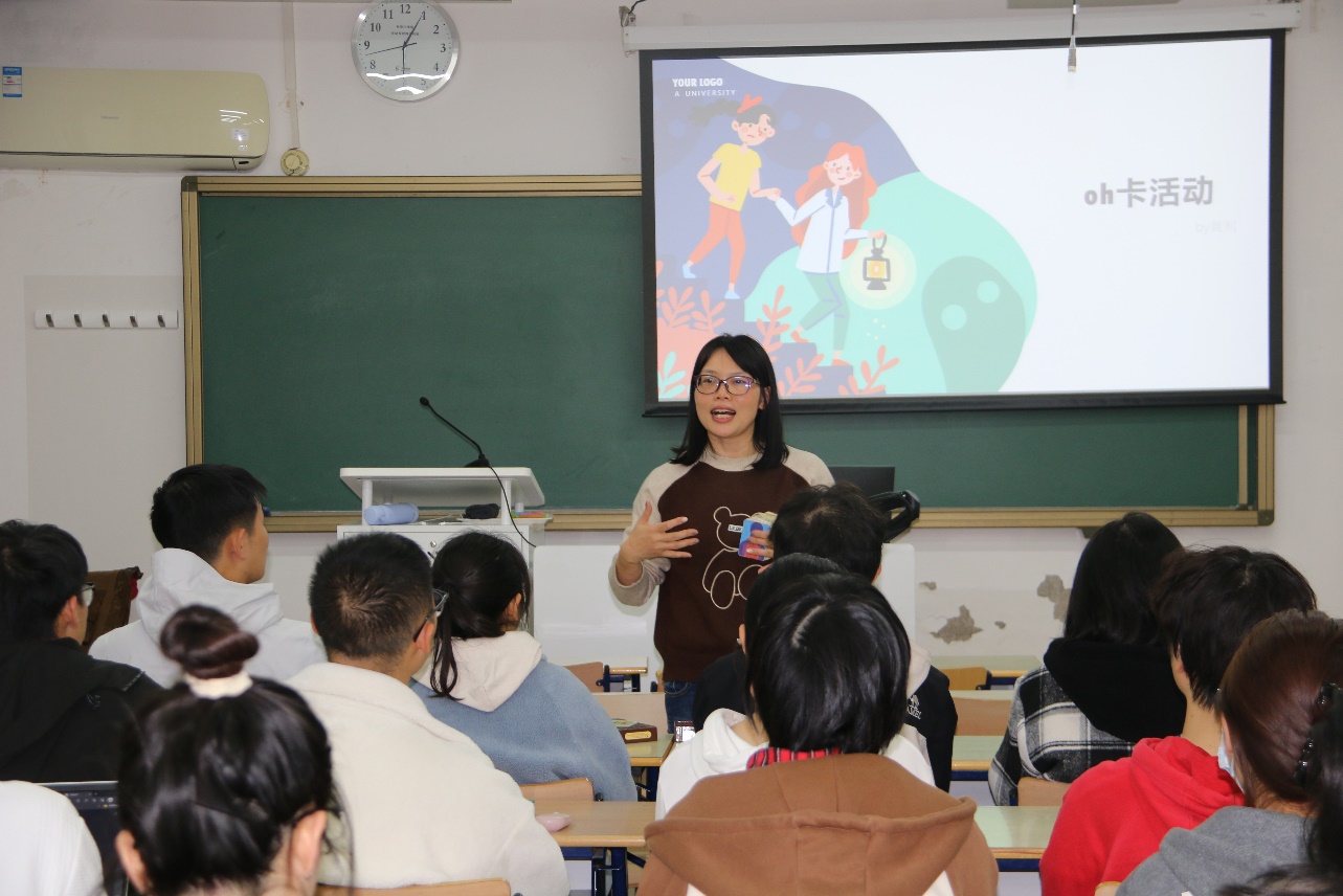 2023年11月7日星期二晚18:00,98色花堂 初级团校与学生会学业部在教四106共同举办“减压赋能”主题体验式讲座,主讲人为98色花堂 学生发展指导中心黄利老师,共二十名同学参加。 首先,黄利老师向同学们介绍了本次活动的道具——oh卡,并组织大家围坐一圈,借助oh卡轮流进行自我介绍。