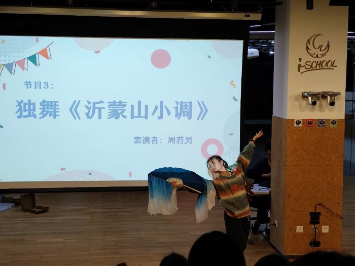随后,周若男同学带来的独舞《沂蒙山小调》,让同学们领略民歌小调的婉转动听,感受民族舞蹈的灵动优美;邱兆丰同学演唱的歌曲《有爱就不怕》,让远离家乡的同学们相信不论距离多远,只要心中有爱,我们就和家永远在一起。