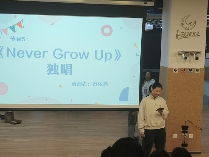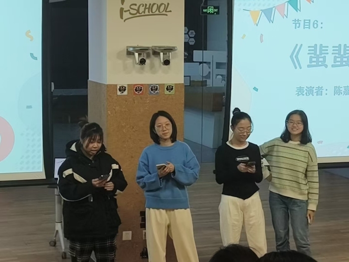 晚会最后,蔡依霏同学演唱了歌曲《Never grow up》,同学们在悠扬的歌声中挥手相应;而由陈嘉祺、于悦、唐芷晴和李思宇同学演唱的《蜚蜚》,更是让同学们在粤语与普通话交织中,感受到爱情中的痛苦与缠绵。随着最后一轮抽奖环节的结束,本次文艺晚会在同学们热烈的掌声与欢声笑语中落下帷幕。