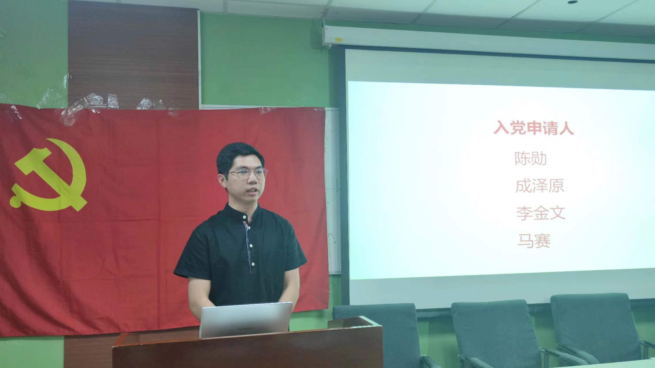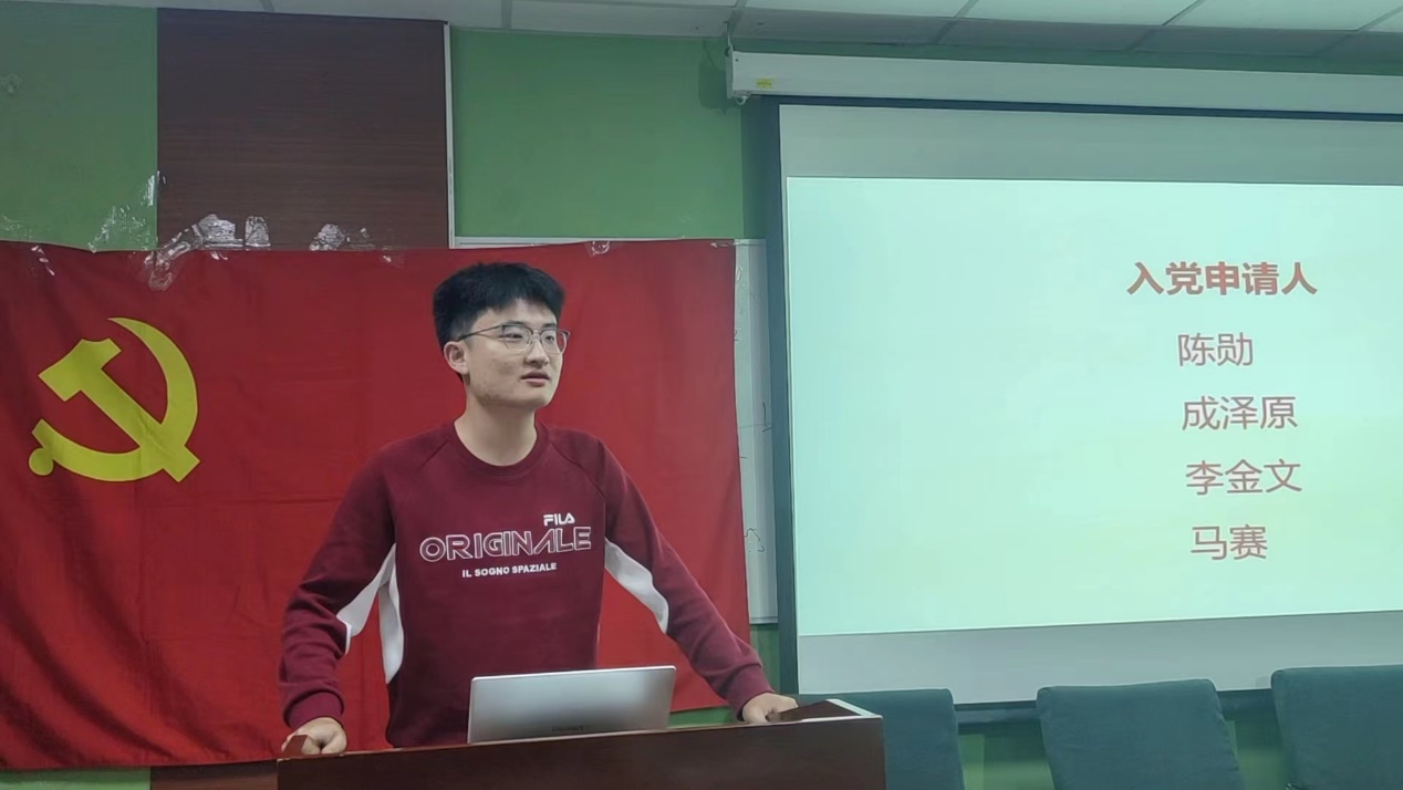 支部书记李紫菲对4为优秀党员介绍完毕,陈勋、成泽原、李金文、马赛4位同志依次进行自我介绍并介绍自己的入党动机。