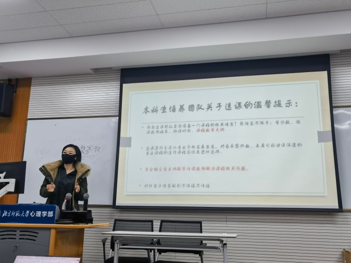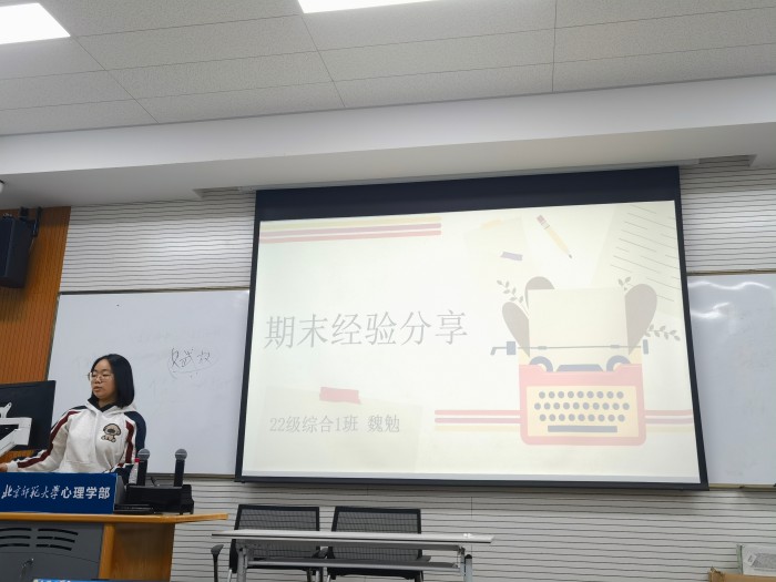 接下来,来自2022级的两位优秀的师姐为大家进行了期末经验分享。首先进行分享的是来自2022级综合2班的丁蓝师姐,师姐针对复习具体时间安排、复习资料等与大家分享了备考规划中的一些策略,并就实验心理学和心理学史两门课详细地与大家分享了相关复习策略。紧接着进行分享的是来自2022级综合1班的魏勉师姐。师姐就发展心理学、心理测量学和实验心理学实验三门课程与大家进行了详细分享,在分享的最后,师姐建议大家可以通过切割任务量、借助思维导图、给自己出题等方法展开有效复习。