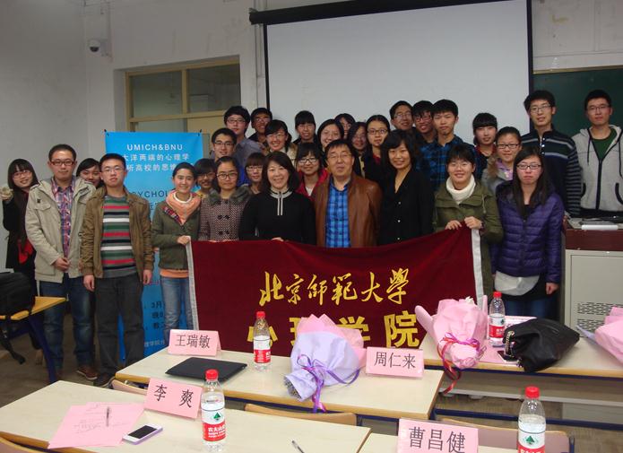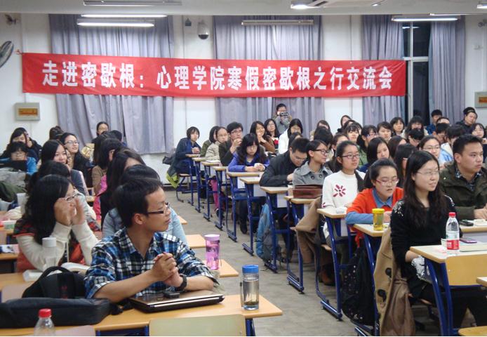 2013年3月13日晚八点,98色花堂 心理学院“走进密歇根:心理学院寒假密歇根之行交流会”在教二201教室举办。2013年1月19日至2月1日,心理学院副院长周仁来老师、分党委书记乔志宏老师及17名本科生组成的代表团前往密歇根大学进行学术交流。在为期两周的时间里,双方教授开展了卓有成效的会谈。参与交流的17名本科生,旁听了密歇根大学心理学系的本科生课程和心理学及其他学科的学术报告会,参与了许多富有特色的学生活动。通过与当地同学的交流全面地了解美国大学的教学、生活情况及中美文化的差异。 心理学院学生会从学生们实际需求出发,邀请代表团的老师、同学为更多学生分享大洋两端的学术进展与不同的校园氛围。此次交流会得到了学校、学院领导的大力支持。心理学院副院长周仁来教授,作为密歇根之行的带队老师之一,对整个活动的策划、进展给予密切关注。心理学院院长许燕教授,国际交流与合作处副处长刘冷馨老师,以及从美国回来的校友韩英全程参与了此次的交流会,与同学们进行了面对面的交流。 许燕院长首先明确了“密歇根之行”对于心理学院具有里程碑意义,向同学们介绍了学院未来对于国际交流方面工作的设想,以及对同学们未来发展的希望与期盼。希望同学们走出去培养自身的国际化视野,然后再回到我们学校、学院为我们的发展做出自己的努力。国际交流与合作处的刘冷馨老师介绍了从自己的角度出发未来国际交流处能为同学们出国交流提供哪些更好的项目,表达了学校对于学生国际交流活动的重视与支持,也热情欢迎学生找她交流沟通。周仁来教授作为最后发言的老师,一方面为大家说明了此次交流会的意义;另一方面也跟同学们分享了“密歇根之行”的总体感受与情况。周仁来教授风趣幽默的表述,让同学们对接下来进行的学生交流环节充满了期待。 前往密歇根交流的三位学生代表朱浩然、黄煜舒、万嘉昕分别从交流活动的行程、从中美课堂不同看中美教育对比以及从自身感受出发谈美国校园文化与社会文化三个方面与同学们进行了分享。嘉宾韩英老师讲述了她20多年的海外经历及自己对于国外生活的体会,对“密歇根之行”同学们的所思所感表示了赞同,也提出了自己长时间在国外生活看到的更多的东西。 提问环节中,在了解同学们的困惑的同时,对于学生们提出的问题许燕院长悉心解答,并提出了自己的希望,希望同学们能够找到学习的内在动机,找到对学习的热情、对生活的热情。同学们都表示,这样与老师面对面的交流、诚挚地沟通的机会特别可贵,在此过程中增强了与老师的情感交流,也同时增进了师生之间的相互理解。至此,密歇根之行交流会圆满结束了,但心理学院为给同学们提供更好的国际交流项目所做的努力还在继续!