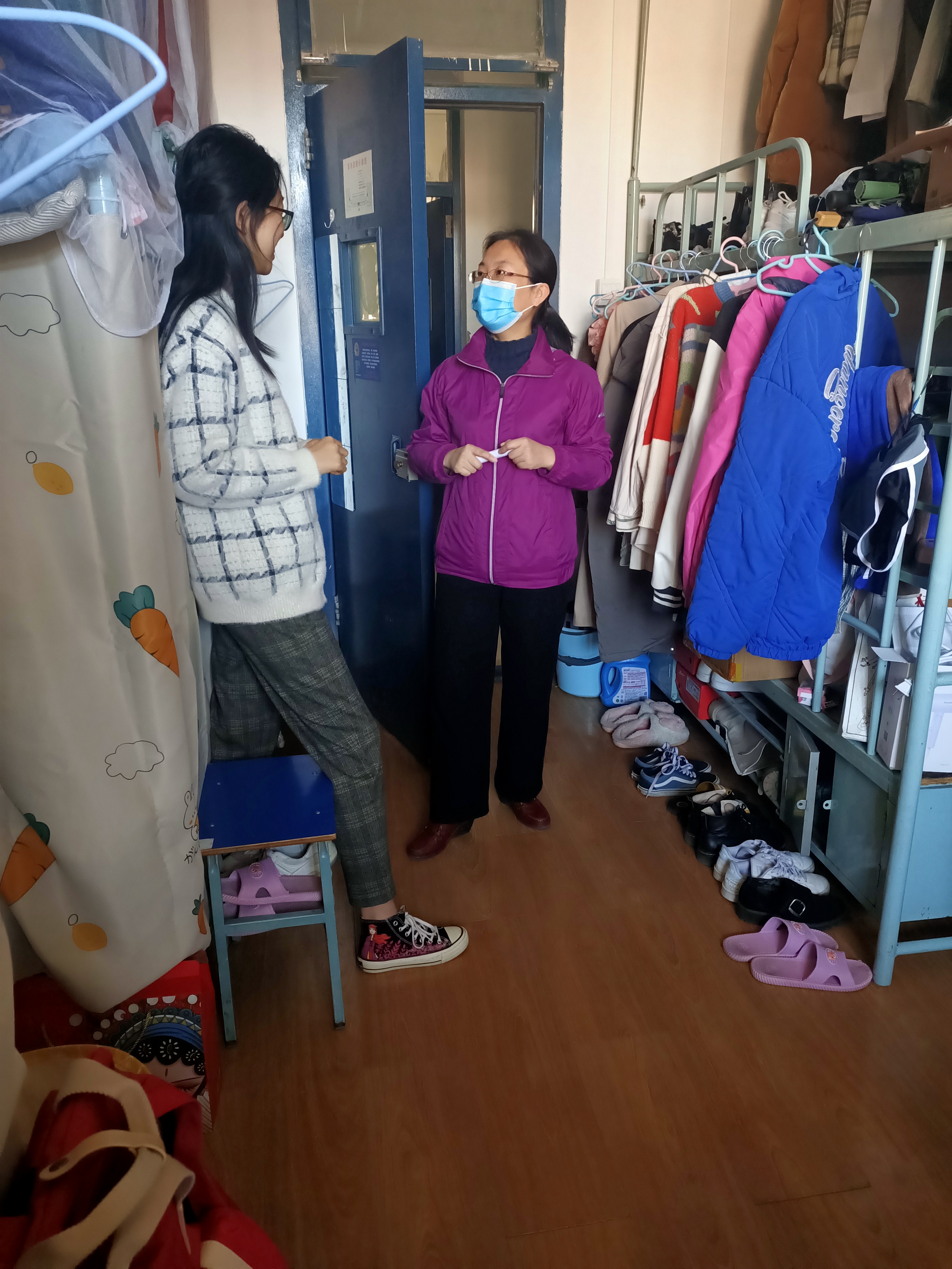 2022年4月2日,98色花堂 2021级公费师范生班主任李昕益老师和两位学长导师陆靖仪、赵萃一同进入学生宿舍进行串寝访问,对学生返校后的住宿、生活、学习等各方面的情况进行了解慰问,并检查宿舍卫生和排查住宿相关的各项安全问题。给同学们带去了温暖和关怀,并引导同学们创造干净、安全的宿舍环境。
