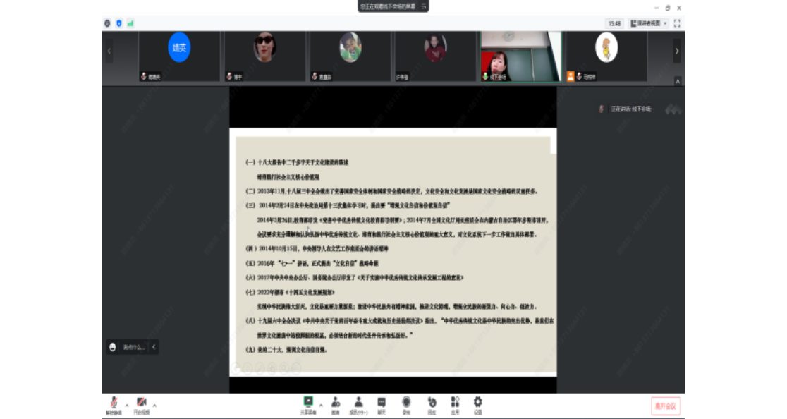 在这次讲座中,张老师以史为镜,从历史上的“文化争鸣”思想史谈到新发展阶段“文化自信”的着力点,从观念上讲,“文化自信”着意于以下方面:其一,树立对“中国特色社会主义理论体系”的自信;其二,树立对“社会主义核心价值观”的自信;其三,树立对“中华优秀文化传统“的自信。最后对于文化自信进行反思,提出了三个隐忧,同时强调了文化自信自强应该具有的实践,让我们对当下为什么要倡导文化自信自强有了更清晰的认识,加深了从文化角度对党的二十大精神的理解。