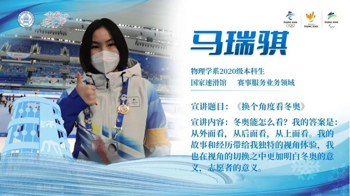 最后为大家带来宣讲的同学是来自物理学院的马瑞骐同学。她的冬奥故事和志愿服务经历,带领我们换个视角看冬奥。在视角的切换中,我们也更能体会志愿者的责任和担当,理解冬奥顽强拼搏的自强精神。