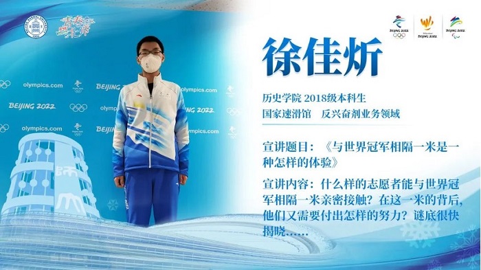 接下来,来自历史学院的徐佳炘同学为我们讲述与世界冠军相隔一米的志愿服务体验。通过翔实的讲述和分享,同志们对于冬奥会的反兴奋剂领域有了更直观的了解,更感受到奥林匹克盛会的核心精神——竞技体育的公正。