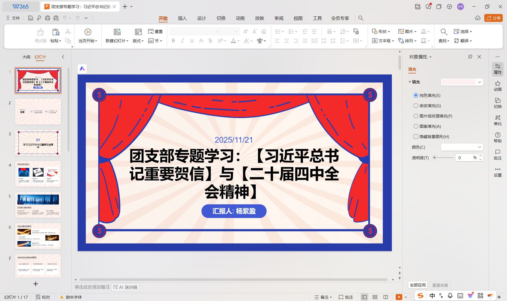 2025年11月22日17时,2025级综合班团支部以线上腾讯会议的形式,召开了“学习习近平总书记重要贺信精神”及“学习党的二十届四中全会精神”专题学习活动,本次会议由团支书杨紫盈同学主持。应到11人,实到8人,请假3人。