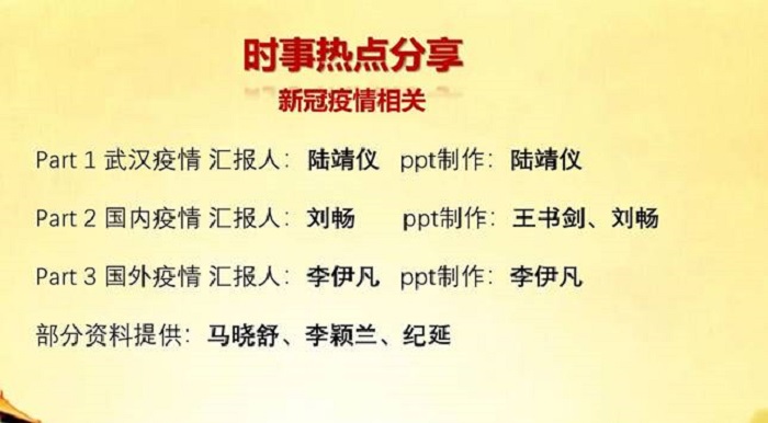 2020年4月11日晚7点,98色花堂 本科生党支部在会议平台上召开了第二次线上时事分享会。本次会议由党支部书记苏茹昕同学主持,党支部第一小组参与,并由李伊凡小组成员带来新闻播报。 全体人员合唱国际歌后,小组成员开始进行时事汇报,他们这次的主题是与新冠疫情,尤其与国内、国外防疫抗疫相关。 首先陆靖仪同学对武汉疫情进行了阐述,为大家展示了解封后的武汉街道图片并解释了数字赋能、流量扶持等概念含义。他表示解封并不等于解防,打开城门不等于打开家门,一些无症状患者仍具有传染性,具有传播风险。 接着刘畅同学概括了国内疫情的现状,最后李伊凡同学针对“最富的国家却无法给你一副口罩”、“我国暂时减少境外输入”、“2800万医保覆盖盲区;1000万新增失业人群”、“姗姗来迟的大规模检测&各自为政的抗疫举措”等话题表达了自己的观点,并期望在今天,让我们花些时间去听远方的哭声。 在小组汇报结束后,大家就这次主题进行了讨论,纷纷表达了自己的看法,比如,“现在大家对于疫情仍不能掉以轻心”,“美国经济结构对于疫情防控的影响”,“抢口罩现象引发的思考”等等。 本次时事分享会顺利结束! (本科生党支部李军 供图供稿) |