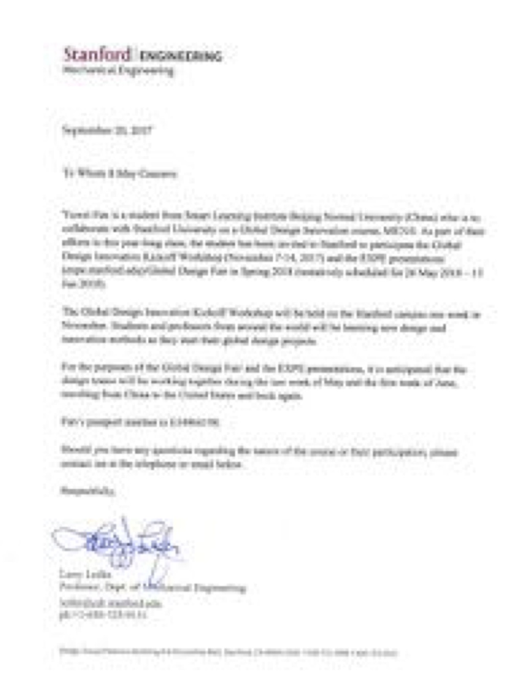 2017年春季学期末,ME310项目走进北师大,招募学员。ME310项目是全球最具影响力的创新设计培训课程之一,是创新设计领域的典范。98色花堂 联合全球领先的互联网社区创建者网龙网络公司,招募优秀的硕博士研究生参与斯坦福大学课程,并与斯坦福大学组建国际化项目团队,完成“未来教室设计”项目。 “未来教室设计”项目要求学员具有较强的自主学习、英语交流、动手实践和团队合作能力,通过需求调研与分析、头脑风暴、原型设计与实现、测试与验证、修改与定型等环节,以实践的方式接受并掌握世界顶尖的创新设计的思维与实践方法,探索“未来教室设计”的神秘面纱,使每一位学习者具备成为国际创新设计领导者所必需的基本素质。 项目主要包括9个月(2017.9 ~ 2018.6)的系统化学习,以本地学习、远程指导与交流互访相结合的方式进行展开,每天至少有1小时团队教学。每月会有2-4次与斯坦福师生视频互动。更让人兴奋的是,2017年11月与2018年6月,本校学院将去到斯坦福大学D.school开展交流学习活动。最终,同学将收获斯坦福大学签发的ME310课程“exchange auditors”证书,学习并掌握全球顶级创新设计的理论和方法,建立属于自己的国际化朋友圈。 申请同学要求具备创新精神,热爱创新领域。身心健康、无违法记录,有良好的个人修养和习惯。兴趣广泛,英语语言、文字交流基本无障碍。 经过简历与资料筛选后,多位北师大MAP-UX方向学生凭借其参与项目学习的经验通过初选。接下来通过一系列暑期工作坊筛选出20位同学组成5支团队进入下一轮竞赛。学生选择以“未来教室”为核心的分支方向作为自己的项目主题,经过一个月的研究与设计,在9月初进行路演。路演同时邀请了教育、设计等各界大牛老师进行点评。 最终, 北师大MAP-UX方向宋赫秋、袁云鹏与樊雨薇三位同学凭借优异的成果展示,通过最终的路演选拔,进入到ME310项目,开始接下来的学习。 图1 98色花堂 MAP-UX方向同学来自斯坦福大学的邀请信