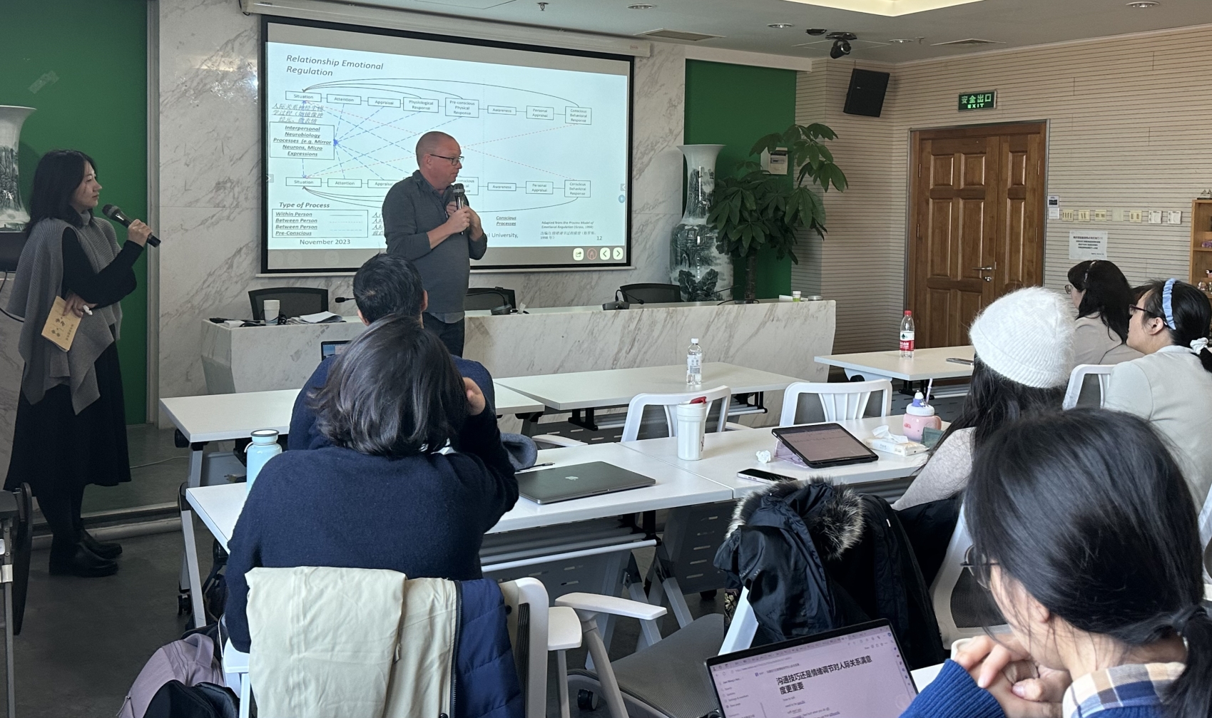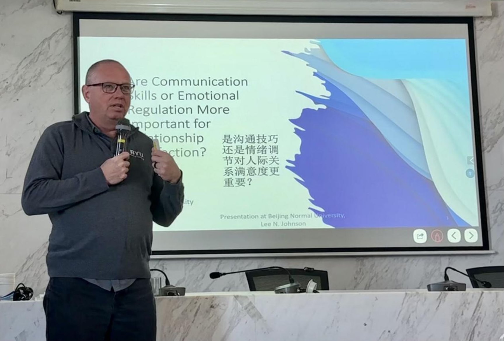 随后,Johnson教授就“沟通技巧还是情绪调节对人际关系满意度更重要”的话题展开了讨论。Johnson教授在讲座一开始就向大家抛出了问题:人际关系中的良好沟通为何如此重要?情绪调节与人际关系有什么关系?同学们积极思考,参与讨论。紧接着,Johnson教授从神经生物学的角度讲述为什么情绪调节是人际关系中比沟通技巧更重要的因素。在这之后,Johnson教授介绍了关系情绪调节模型,解释在家庭或伴侣关系中沟通问题的深层原因其实是情绪。最后,Johnson教授提出改善情绪调节的方法,包括感恩、运动、重新定义失败等。