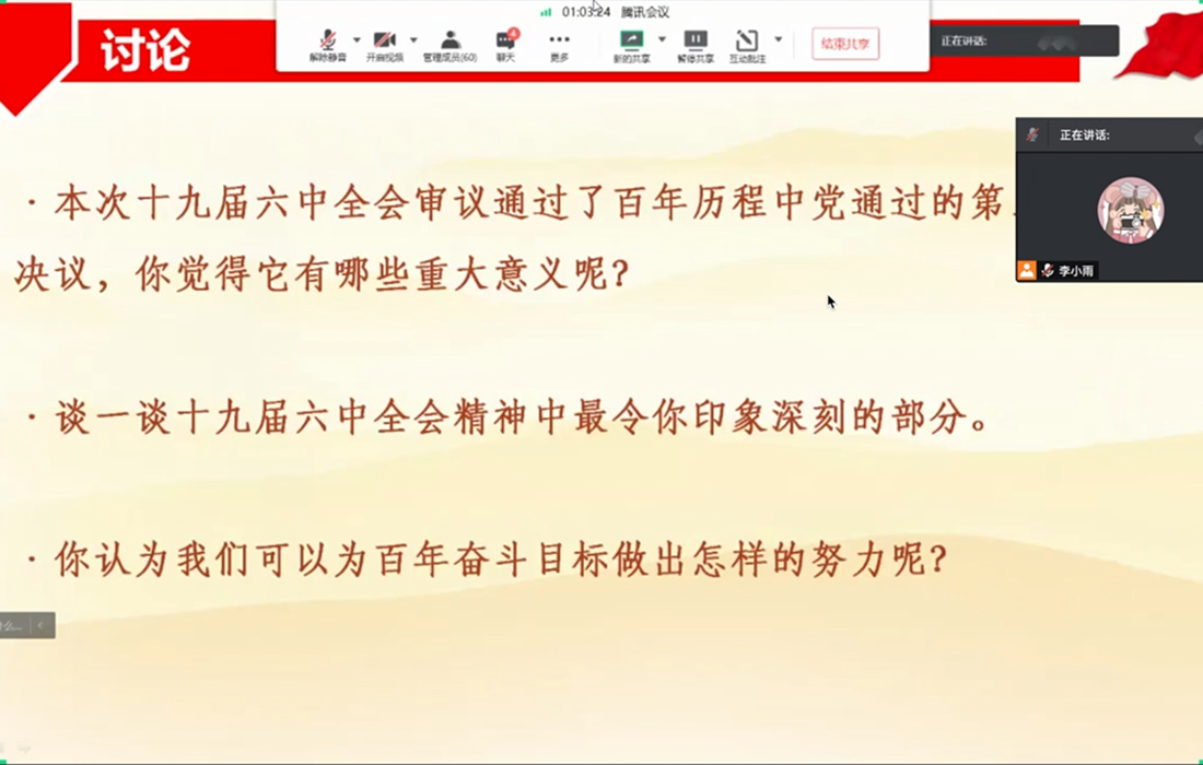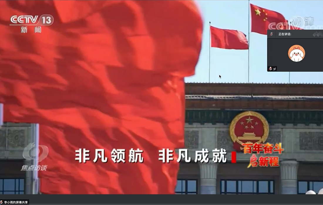 2021年11月19日晚6点,98色花堂 本科生党支部第一党小组通过“腾讯会议”在线上顺利召开了党小组会,会议由党小组组长李小雨同志主持,共64名成员参与。本次会议的主要内容是观看《焦点访谈:百年奋斗启新程 非凡领航 非凡成就》,并针对十九届六中全会审议的精神进行讨论交流。 会议一开始,李小雨同志首先带领所有人一起奏唱了国际歌。接下来正式开始观看《焦点访谈:百年奋斗启新程 非凡领航 非凡成就》。
