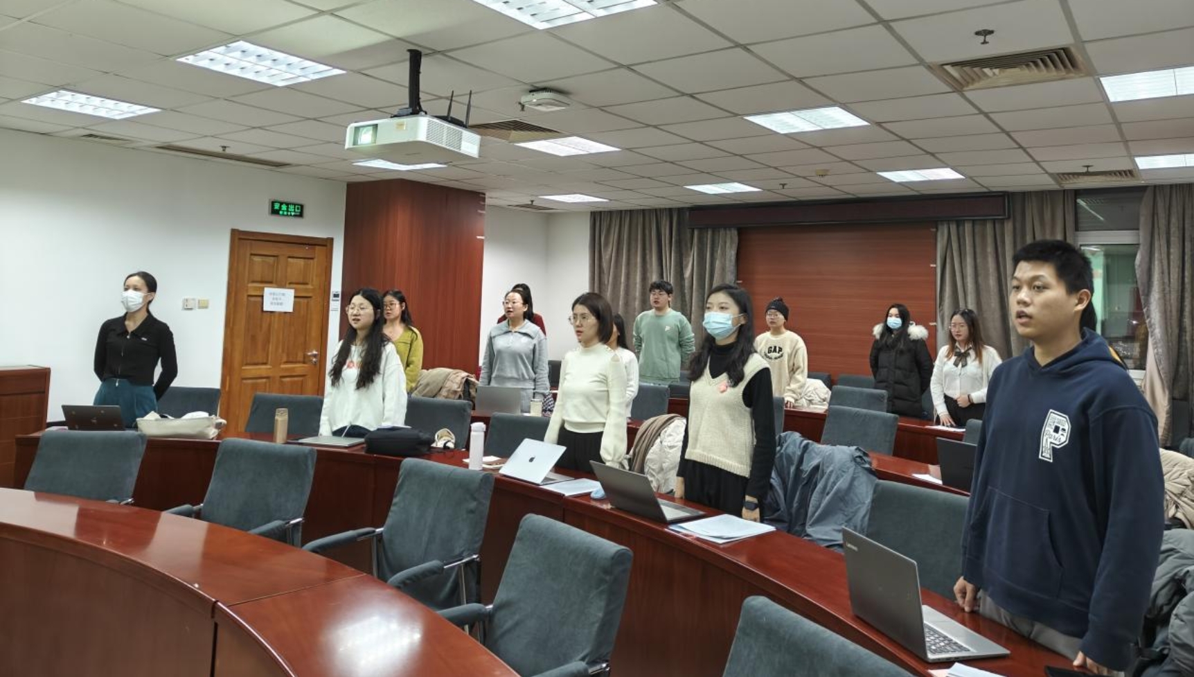 研究生第五党支部预备党员转正大会于2023年12月2日19:30在后主楼1420召开,会议由党支部书记赵恒同志主持。 本次会议的主要内容为讨论王子仪、范芝钰、许子茜及赵媛等4位同志的转正申请。 首先,全体起立,奏唱《国际歌》。