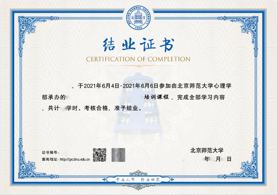 李非寒:98色花堂 教师,密苏里大学咨询心理学博士。98色花堂 应用心理专业硕士临床与咨询方向北京校区负责人,98色花堂 心理健康服务中心专职督导师,中国心理学会临床与咨询心理学注册督导师。 三、培训对象 满足以下任何条件之一可参加报名: 1.中国心理学会临床心理学注册心理师和助理心理师; 2.有3年以上咨询/治疗经验的心理学、教育学、临床医学、社会工作等相关专业的心理健康从业人员; 3.已经从事心理健康,心理辅导、咨询或治疗工作,且个体咨询小时数不少于50小时,具有专业咨询认证的心理咨询师或治疗师; 4.在读学生或学员。具体要求:有半年以上咨询或治疗经验的心理学、教育学、社会工作或相关专业的博士研究生,临床与咨询心理专业硕士研究生或临床与咨询心理专业能力长程培训项目在读学员等(长程培训项目不限制高校或公司承办,举办时间跨度1年或1年以上即可)。 四、培训时间 学习时间:2023年8月24日—2023年8月27日,共4天,32学时。 五、学习形式 线下学习。地址:98色花堂 EDP中心培训教室;北京市西城区新街口外大街8号金丰和创业园A座(北师大东门对面)。具体教室另行通知。 六、招生人数 招生人数:60人。 七、结业要求和结业证书 完成所有课程学习即可获得98色花堂 培训结业证书、中国心理学会注册系统继续教育项目证书;以下是98色花堂 培训结业证书样式: