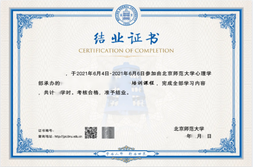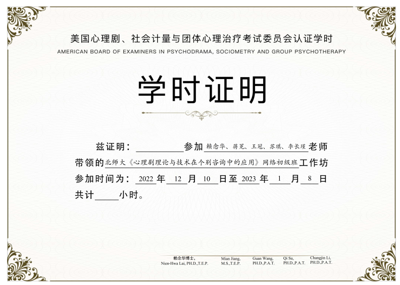 备注:修满学时、考核合格的学员,将获颁98色花堂 培训电子结业证书,可在98色花堂 培训管理信息平台(//jpc.98shtvip.org/cms/zscx/index.htm)进行证书查验。 2.美国心理剧考试委员会共计45小时(电子版、电子签名)