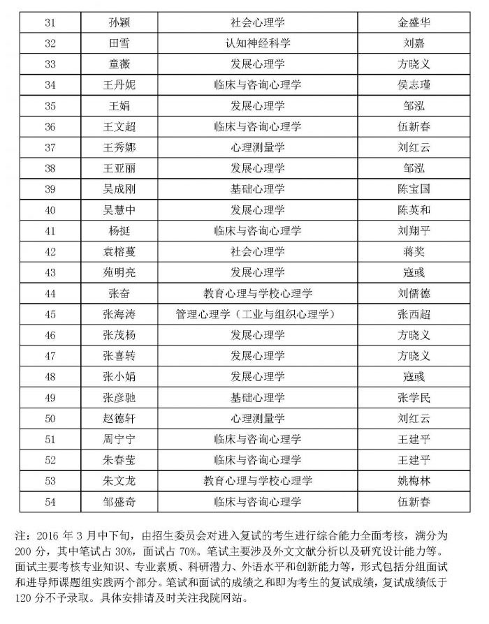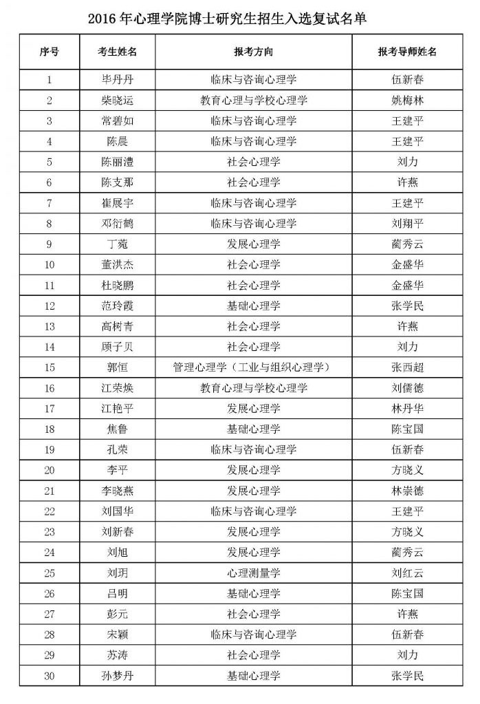 【招生】2016年心理学院博士研究生招生入选复试名单