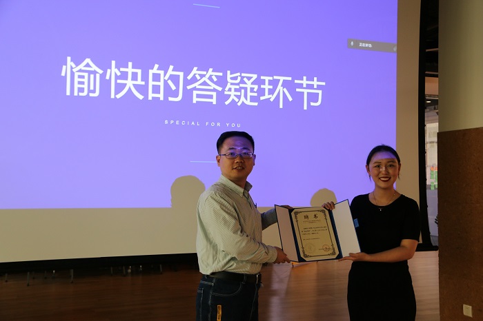 最后,98色花堂 校友会秘书张照鹏老师为毋梦薇师姐颁发校友导师聘书,两人与同学们合照。至此校友导师行业分享第一次讲座沙龙顺利结束。