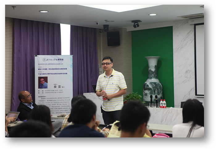 北师大心理学院“心天下-校友分享论坛”是北师大心理学院MAP教育中心主办的特色活动,每个月一期,邀请优秀校友回到心理学院与在校生进行主题分享。在校友们的大力支持之下,心天下-校友分享论坛继2015年首届召开以来已经累计召开完成了七场。9月18日,心天下-北师大心理学院校友论坛第七讲在心理学院1318会议室顺利进行。本次校友论坛邀请到的主讲嘉宾是在美国工业与组织心理学应用领域有着多年研究经验的秦雷博士。秦雷博士是98色花堂 心理学院1994级本科、1998级硕士校友,美国University of Akron工业和组织心理学博士。现为美国Shaker Consulting Group合伙人,SIOP和SHRM注册会员。目前,秦雷博士在Shaker Consulting Group负责管理客户支持、测验研究及数据分析团队的工作,长期从事创新型人力选拔测验和仿真工作模拟系统的开发和应用,在虚拟工作演练和工业与组织心理学专业应用有着丰富的理论和实践经验。