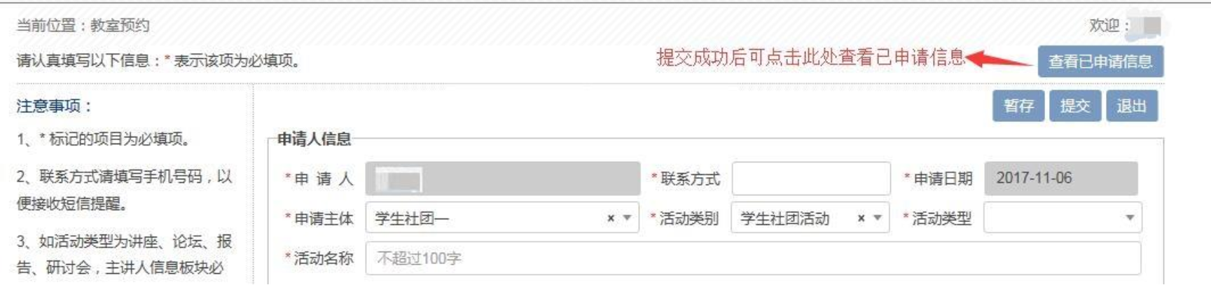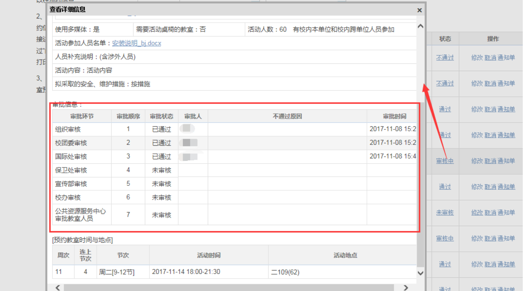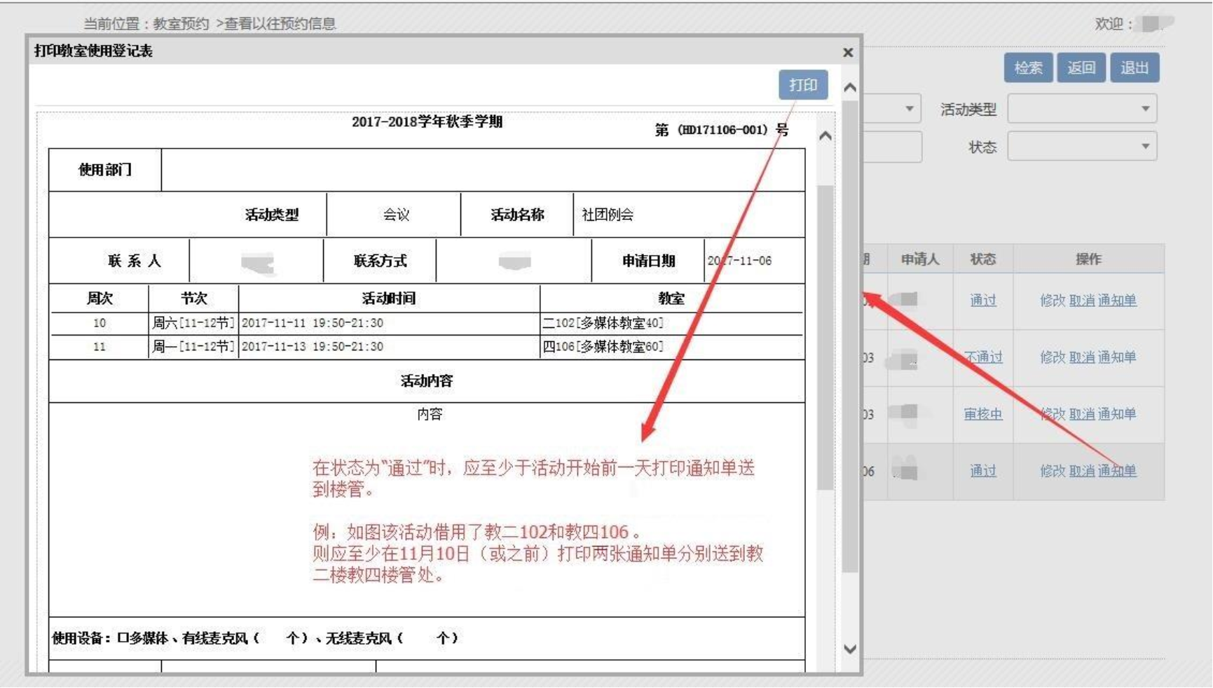 注意:在审核完成(状态为“通过”时),请及时打印通知单,并至少于活动开始前一天送到对应教学楼楼管。