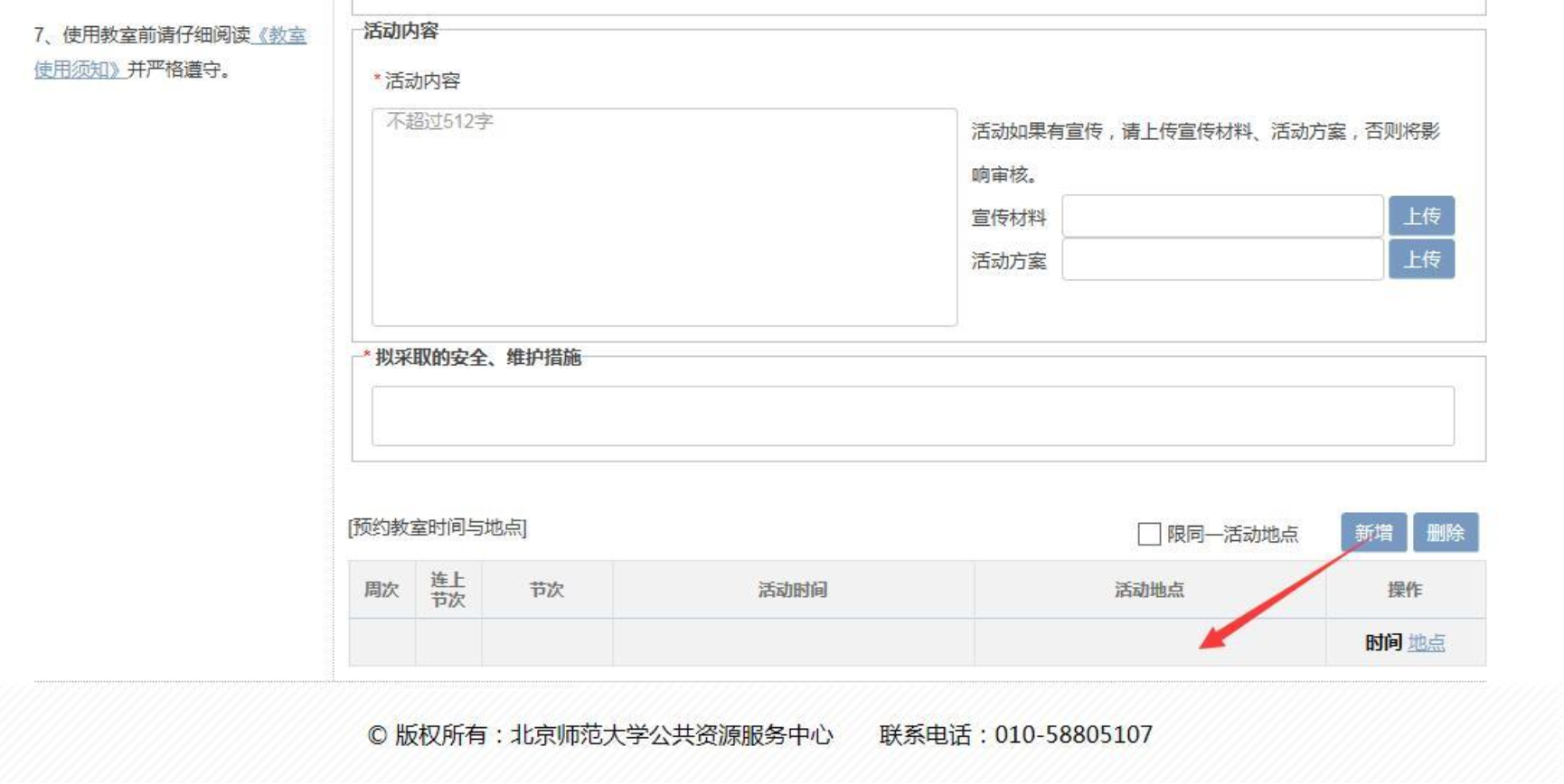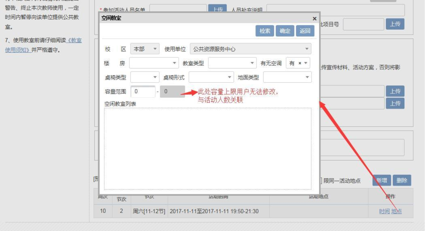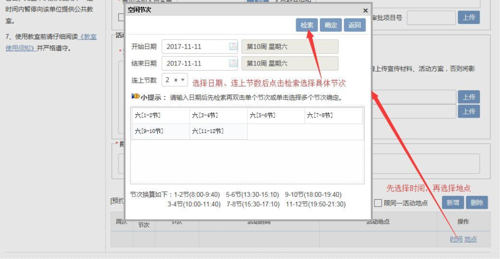 3.选择活动时间和教室,特别注意: (1) 选择时间后、节数后,需点击检索后选择相应节次。 (2) 选择地点时,注意选择教室类型(默认为多媒体教室,学校公共教室大部分为多媒体教室)、桌椅类型(可选活动或者固定桌椅)。 (3) 公共教室不接受除第 12 节以外的单数节次预定。