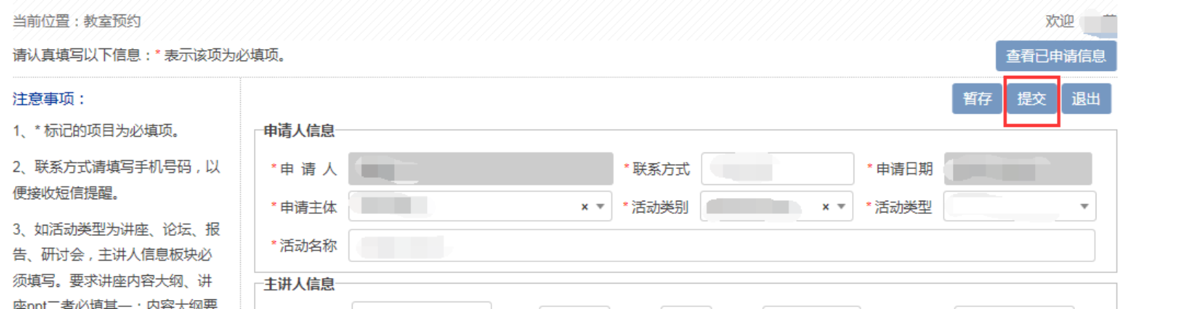 各学生组织、各班级、党团支部: 为充分利用学校资源,学校为各学生组织提供了申请使用学校公共教室资源的渠道,以便于日常开展各类讲座、培训、学生活动等。具体操作流程详见下。 一、系统入口 1.线上系统名称为“教务管理系统-预约教室”。 2.系统入口为 “数字京师” → 左侧栏“全部应用”搜索“教务管理系统” → “个人事务”中“预约教室”服务。 特殊说明:各学生组织和班级仅有主负责人有预约权限,如学部团委副书记、学生会研究生会执行主席、各班级班长、各学生党支部党支书;其他同学无预约权限。 二、预约步骤: 1.阅读左侧注意事项。 2.按要求填写必填项内容,特别注意: (1) 联系方式请填写手机号码,以便接收短信提醒。 (2) 活动人员构成部分,三种人员构成类型必选一项,选择后填写活动人数,人数与可申请教室关联,请如实填写。