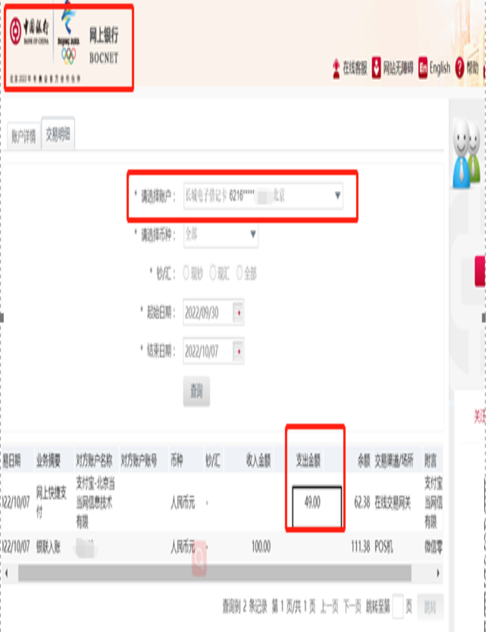 网银截图(中行卡支付记录)样例