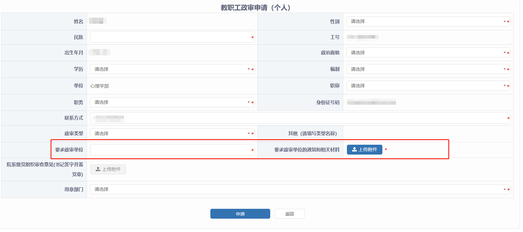 2.填报系统中要求的各项内容,完整上传要求政审单位的通知和相关说明材料,便于学部党委进行审核;